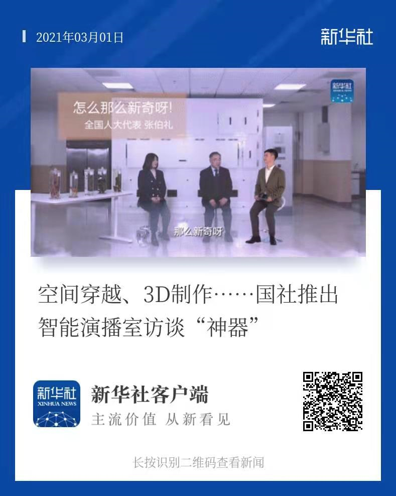 2021年天下“两会”前夕,,,,,,北京新华社新立方智能化演播室与天津中医药大学实验室睁开了一场独具匠心的“异地同屏”访谈。。。此次异地访谈的视觉泛起,,,,,,让众人惊呼真实,,,,,,犹如在统一空间举行交流互动。。。这也是新华社继去年的“全息异地同屏”后,,,,,,再次探索将数字化“黑科技”运用到两会访谈中。。。